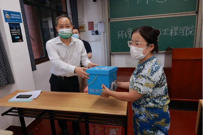 最后,学院领导为在座同学发放了环院定制的慰问礼包。本次慰问品由学院精心准备,除了丰富的零食大礼包,还为同学们准备了在线影院 定制小风扇与院衫。