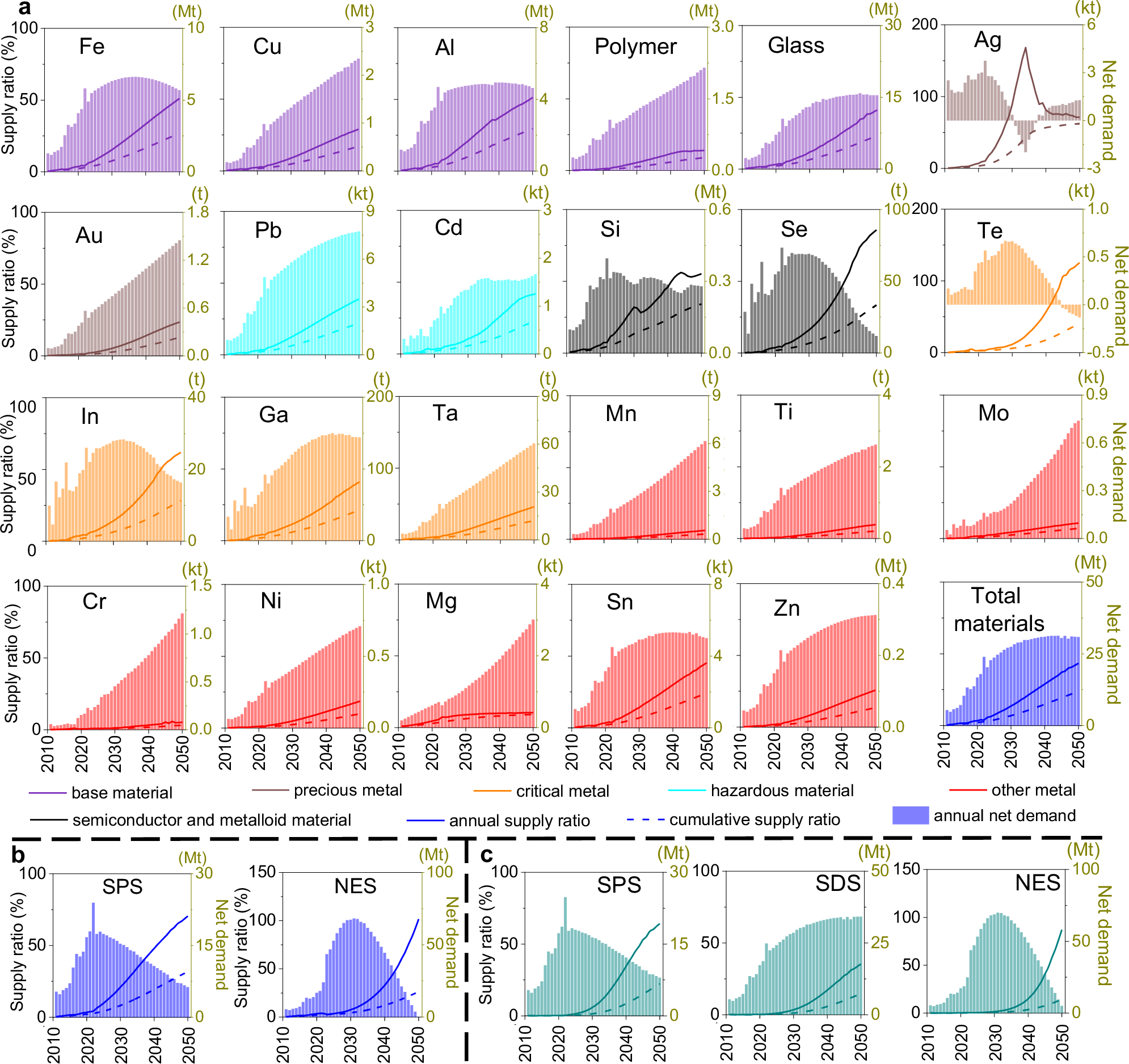 随着全球光伏装机容量的迅猛增长,光伏能源正逐渐成为未来能源体系的重要支柱。然而,这一快速扩张也带来了两大挑战:一是对原生矿产资源的需求不断攀升,威胁材料供应的可持续性;二是退役光伏系统废弃物量的急剧增加,可能引发潜在的环境风险。人为矿物循环(即从废弃物中回收并再利用矿物资源)被认为是协同解决资源供应与废物管理问题的关键途径。为此,该研究构建了一个定制化模型框架,系统评估了在既定政策情景(SPS)、可持续发展情景(SDS)和净零排放情景(NES)三种不同能源发展路径下,五种主流光伏技术(单晶硅、多晶硅、非晶硅、碲化镉、铜铟镓硒)所涉及的23种材料的二次供应潜力,并进一步量化了二次材料供应在缓解金属关键性、提升经济潜力以及减少碳排放方面的作用。研究为光伏产业的可持续发展和全球能源转型提供了科学依据。