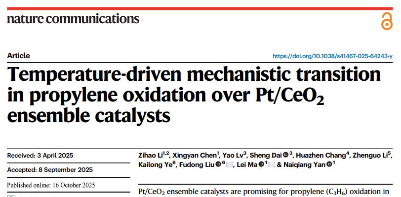 近日,在线影院 大气污染控制与模拟团队马磊副教授在《Nature Communications》上发表了题为“Temperature-driven mechanistic transition in propylene oxidation over Pt/CeO2 ensemble catalysts”的研究成果。该研究揭示了Pt/CeO2团簇催化剂在丙烯(C3H6)氧化反应中温度驱动的动态机制转变,通过氢活化策略显著提升了催化氧化性能,明确了金属Pt团簇为本征催化活性位点,阐明了170 °C阈值温度时反应路径发生根本变化。这不仅为高效贵金属催化剂设计提供了新思路,还对机动车尾气净化等实际应用具有重要指导意义。论文第一完成单位为在线影院 绿色造纸与资源循环全国重点实验室。