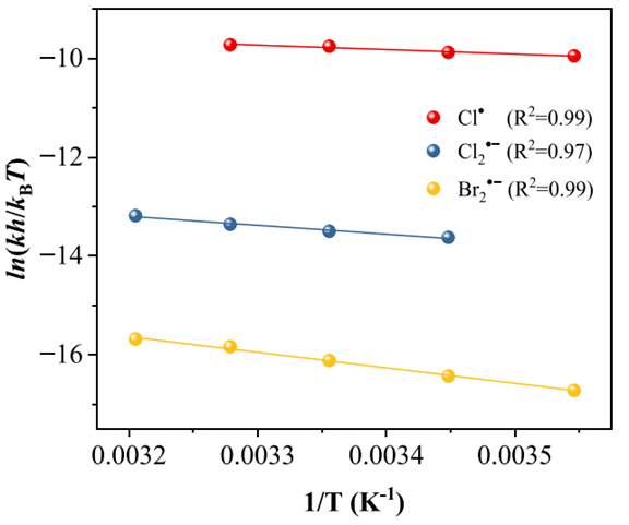 图3. SRNOM与Cl·, Cl2·−和Br2·−反应的Eyring图。斜率和截距分别代表-ΔH≠/R和ΔS≠/R。
