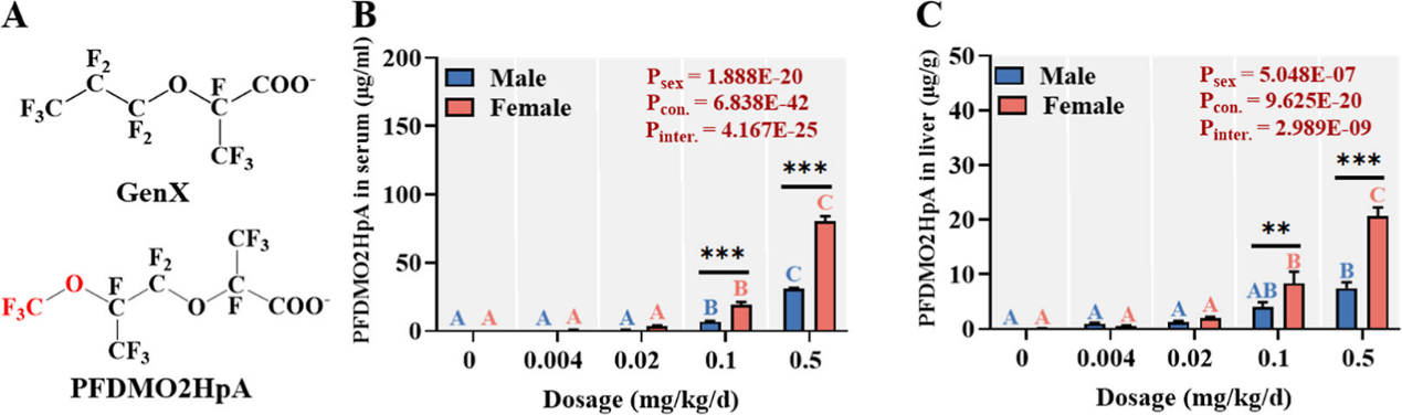 图1. 雌雄小鼠经28天暴露后血清和肝脏中PFDMO2HpA的化学结构及含量
