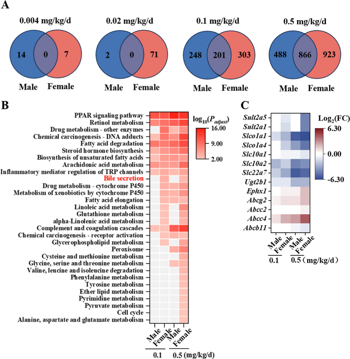 进一步通过转录组学探究了PFDMO2HpA的肝毒性机制(图3)。差异表达分析显示,随着剂量升高,雌雄共享差异基因数呈剂量依赖性增加。值得注意的是,雌鼠在0.1和0.5 mg/kg/d剂量下的性别特异性差异基因数量显著高于雄鼠。对差异表达基因进行富集,发现雌性富集通路数同样远超雄性,雌鼠特异性富集的5条通路中,胆汁分泌通路最为显著(图3B)。针对胆汁酸转运代谢相关基因的深入分析表明,多数基因(如Ephx1、Slco1a1、Abcc4等)在雌性中表达水平的变化更为显著(图3C)。