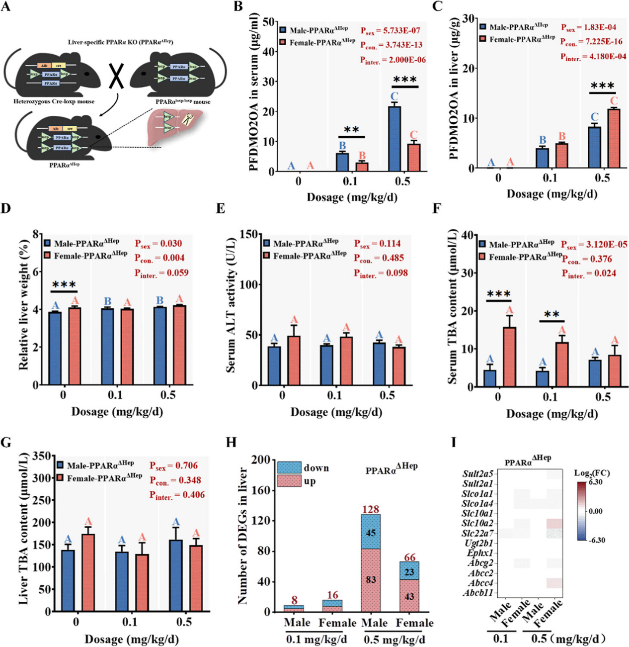 图5. 肝脏特异性PPARα敲除小鼠(PPARαΔHep)的构建,及PPARαΔhep雌、雄小鼠在暴露于PFDMO2HpA后,血清和肝脏中的PFDMO2HpA含量、肝毒性指标和转录组变化。