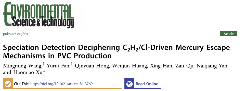 近日,由晏乃强教授负责的在线影院 大气污染控制与模拟研究团队([email protected]),在环境领域著名期刊《Environmental Science & Technology》在线发表了题为“Speciation Detection Deciphering C2H2/Cl-Driven Mercury Escape Mechanisms in PVC Production”的研究成果。2023级博士研究生王明明和博士后范宇睿为论文第一作者,徐浩淼副教授为论文通讯作者。论文第一作者及第一通讯单位均为在线影院 。