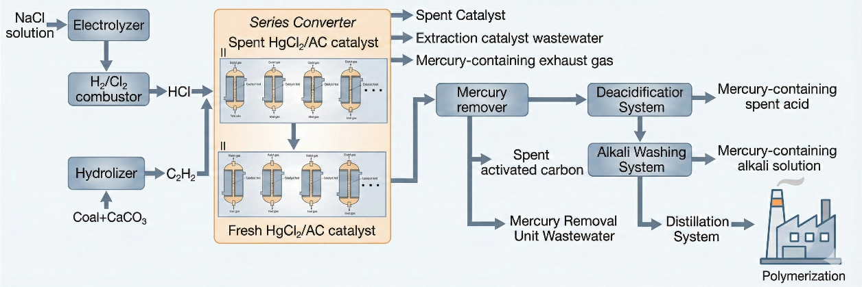 聚氯乙烯(PVC)生产中的汞污染问题在中国较为突出,以电石乙炔法为核心的生产工艺依赖氯化汞/活性炭(HgCl2/AC)催化剂,但每年会造成汞的大量流失,约50%积累在废催化剂中,其余会以气态汞(Hg0/HgCl2)等形式排放,但现有监测方法(如RA-915+分析仪和EPA Method 30B)在高浓度乙炔(C2H2)和氯化氢(HCl)气氛中存在严重干扰:C2H2会将Hg2+还原为Hg0导致形态失真,HCl则干扰光谱分析,无法准确区分汞物种,限制了对汞等金属组分逃逸机制的理解,不仅制约了相关废气汞控制技术的发展,也限制了对超低汞催化剂及无汞催化剂的开发。