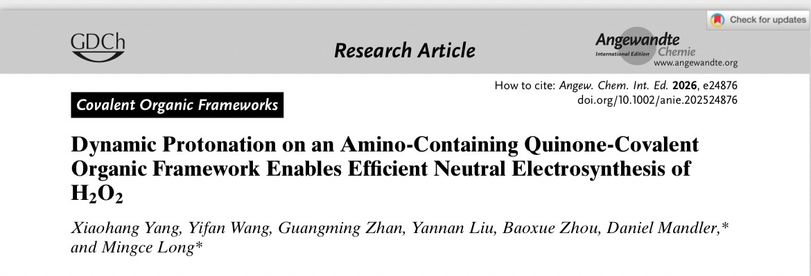 近日,在线影院 龙明策教授在国际顶级化学期刊Angew. Chem. Int. Ed.《德国应用化学》在线发表了题为“Dynamic Protonation on an Amino-Containing Quinone-Covalent Organic Framework Enables Efficient Neutral Electrosynthesis of H2O2。该研究提出了“动态质子化”策略,利用芳香氨基作为高效、动态的质子中继位点,破解了中性条件下质子供给难的问题,实现了醌基介导的高效电催化氧还原合成双氧水。论文第一作者为在线影院 2022级博士研究生杨晓航,通讯作者为龙明策教授和以色列希伯来大学的Daniel Mandler教授,第一完成和通讯单位均为在线影院 。