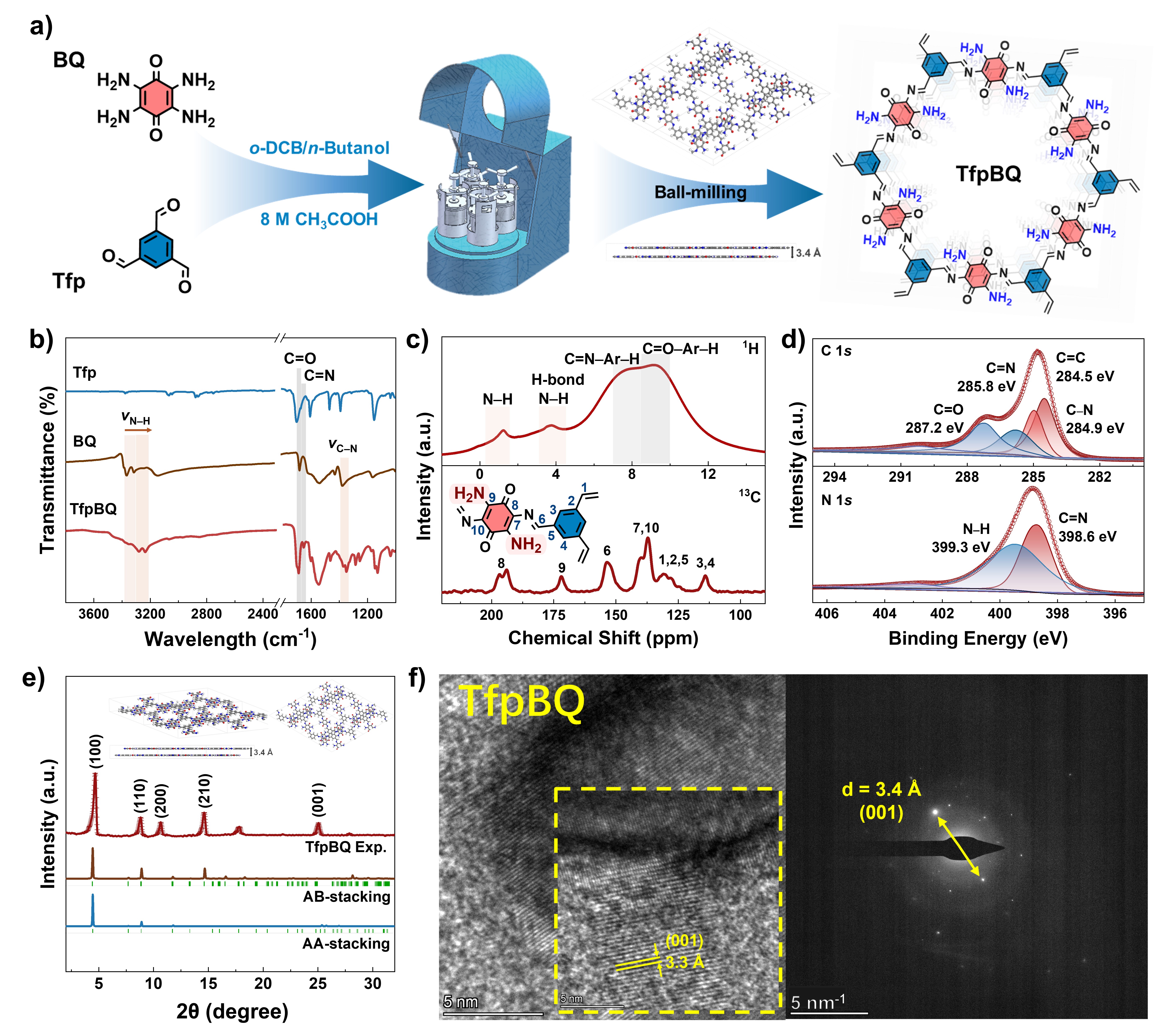以四氨基对苯醌和均苯三甲醛单体为原料、在机械球磨作用下进行希夫碱缩聚反应,得到以亚胺为连接键的含有芳香氨基和醌基的COF电催化材料TfpBQ。傅里叶变换红外(FTIR)光谱等一系列表征技术证实了亚胺(C=N)连接键的生成、以及芳香氨基(-NH2)和醌基(C=O)的成功引入;粉末X射线衍射分析(PXRD)和高分辨透射电子显微镜(HR-TEM)证实了所制备Q-COF具有高结晶性。