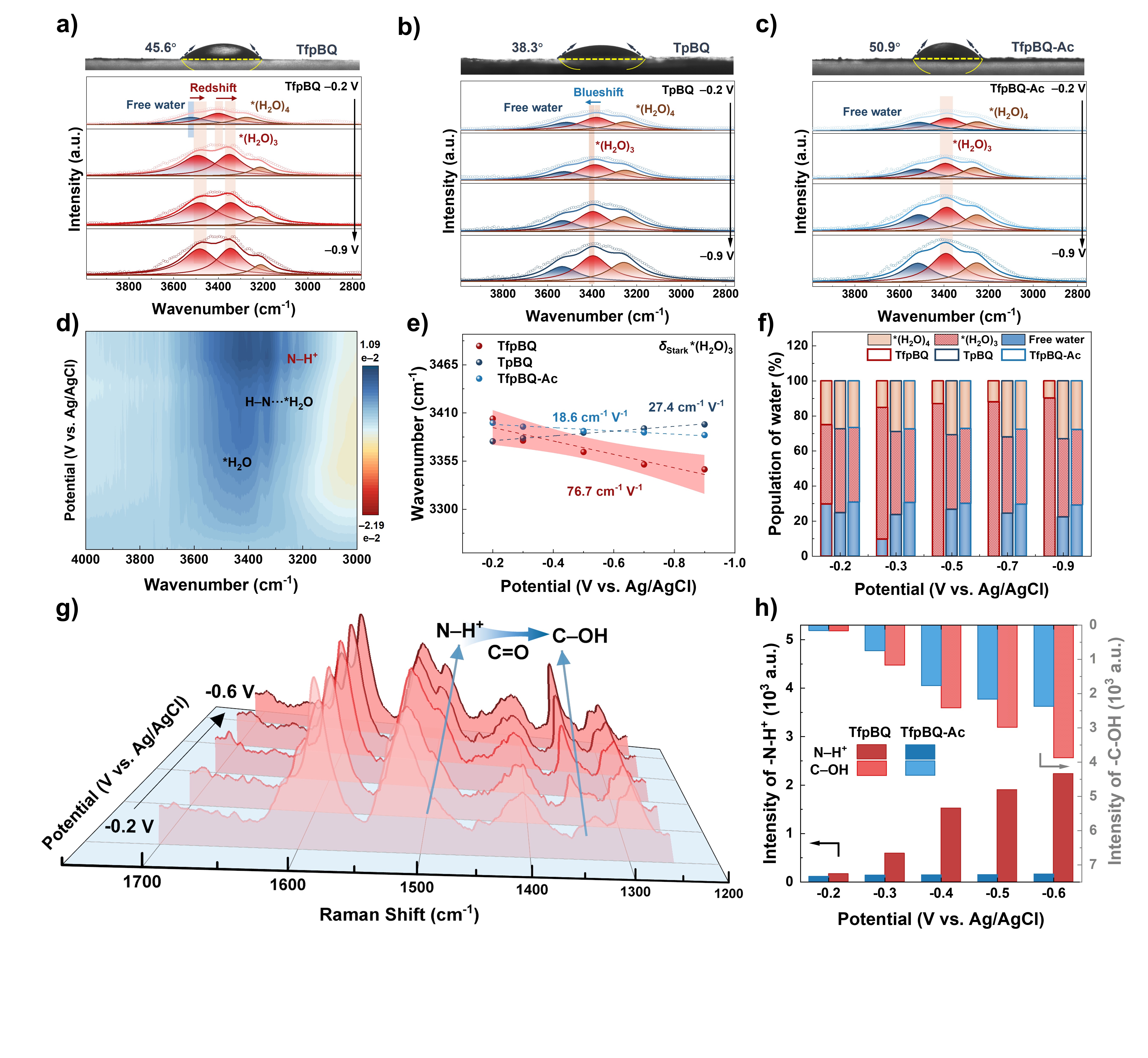图5 TfpBQ电极上界面水演化和氧气还原过程的原位光谱研究