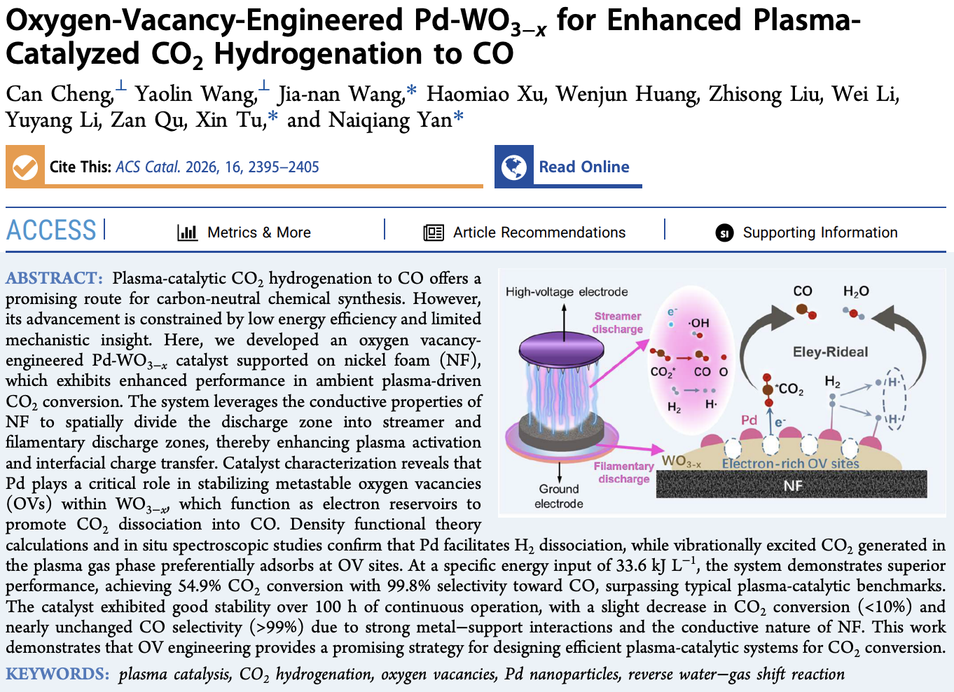 近日,在线影院 晏乃强教授团队与英国利物浦大学屠昕教授团队合作在ACS Catalysis在线发表了题为“Oxygen-Vacancy-Engineered Pd-WO3-x for Enhanced Plasma-Catalyzed CO2 Hydrogenation to CO”的研究成果。