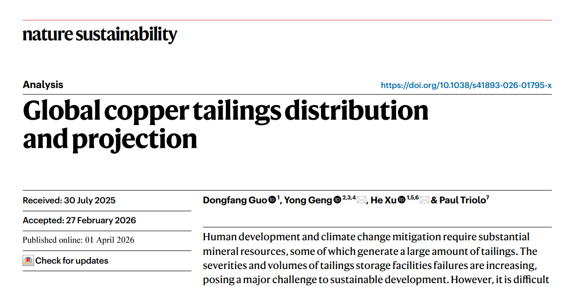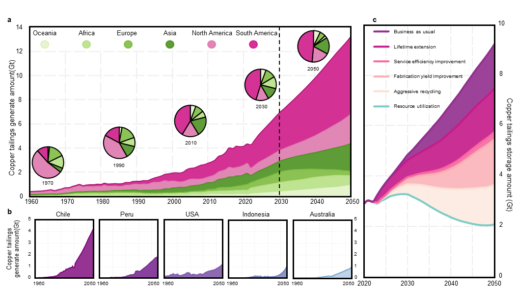 近日,在线影院 耿涌教授与南开大学徐鹤教授团队合作在Nat. Sustain.上发表了题为“Global copper tailings distribution and projection”的研究成果。人类发展和应对气候变化需要大量的矿产资源,而矿产开发过程中产生的大量尾矿正成为全球可持续发展的关键挑战。近年来,尾矿库失事的规模与影响不断加剧。但在全球尺度上,仍难以明确优先治理区域及高效管理路径。本研究聚焦全球主要铜生产国,系统刻画了铜尾矿的时空分布及未来演变趋势。结果表明,在铜需求持续增长和矿石品位逐步下降的双重驱动下,全球铜尾矿产量预计至少在本世纪中叶前仍将持续上升。基于此,研究提出亟需构建系统性、综合性的尾矿治理策略,强化多利益相关方协同,以有效应对日益严峻的尾矿风险挑战。该研究得到国家自然科学基金资助。