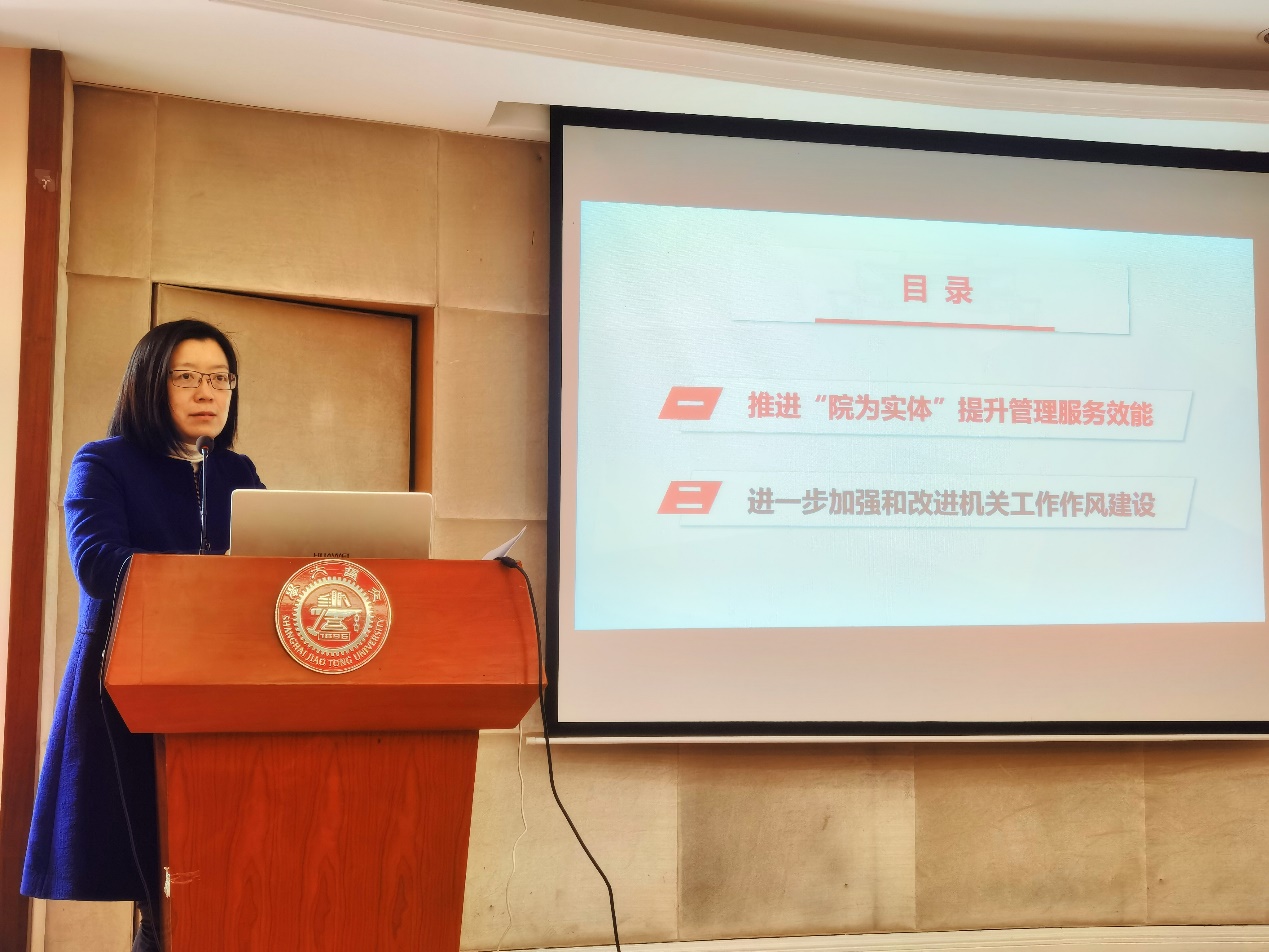 胡薇薇解读了学校《关于进一步加强校院两级机关作风建设提升管理和服务效能的意见(试行)》的文件精神,她指出,作风建设永远在路上,为巩固“不忘初心、牢记使命”主题教育成果,落实中央巡视整改工作,加快完善学校治理体系、切实提升治理效能,建立与构建“综合性、创新型、国际化”办学新格局相匹配的管理和服务队伍,提升管理和服务效能是“院为实体”改革的阶段性重点任务。坚持问题导向,建立健全政策制度,贯彻执行工作机制,加强完善队伍建设。学院行政及教辅人员应进一步改进工作作风,保持人人主动想事、谋事、干事的状态,密切联系师生,深入师生、服务基层、保障前线。加快推动数字化转型,推进“一门两时三再造”,实现部门业务一门式办理,推进政策及时送达、业务限时办理,推动各部门业务再造、管理再造、服务再造。建设一流管理和服务队伍,推进学习型、研究型、创新型机关建设,着力提高管理服务人员的研究能力和工作效率,让想干事者有机会,让能干事者有舞台。
