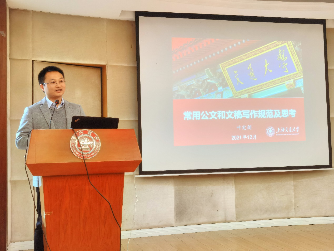 叶定剑作了题为《常用公文和文稿写作规范及思考》的报告,他谈到,公文是有规范的,文稿写作要符合发言人的习惯,应多研读、多对比、多思考。他以在国家机关、教育部和学校党政机关的工作经验为例,对公文的规范性和文稿的契合性进行了阐述。